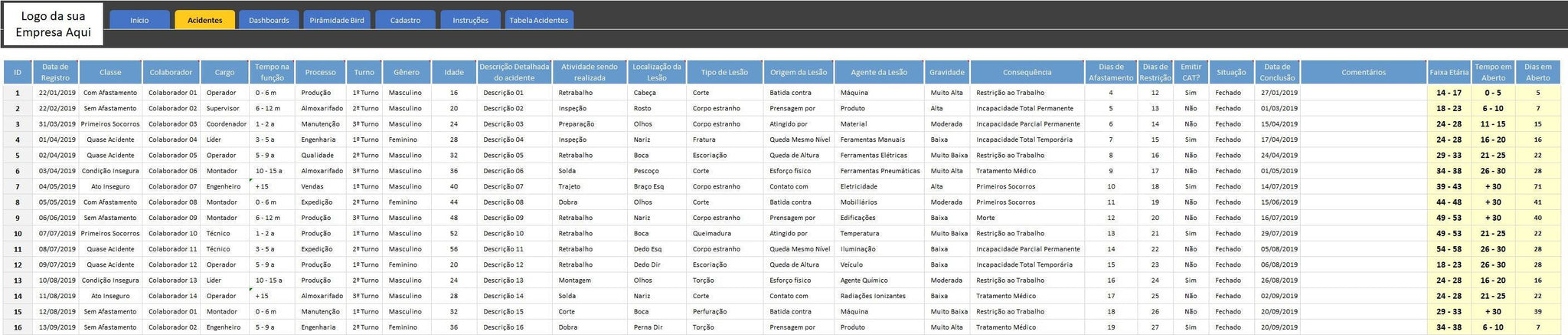 Registre e monitore todos os acidentes e incidentes de trabalho em uma única planilha, isso irá otimizar o processo de coleta e registro de dados, facilitando o gerenciamento de acidentes de trabalho.