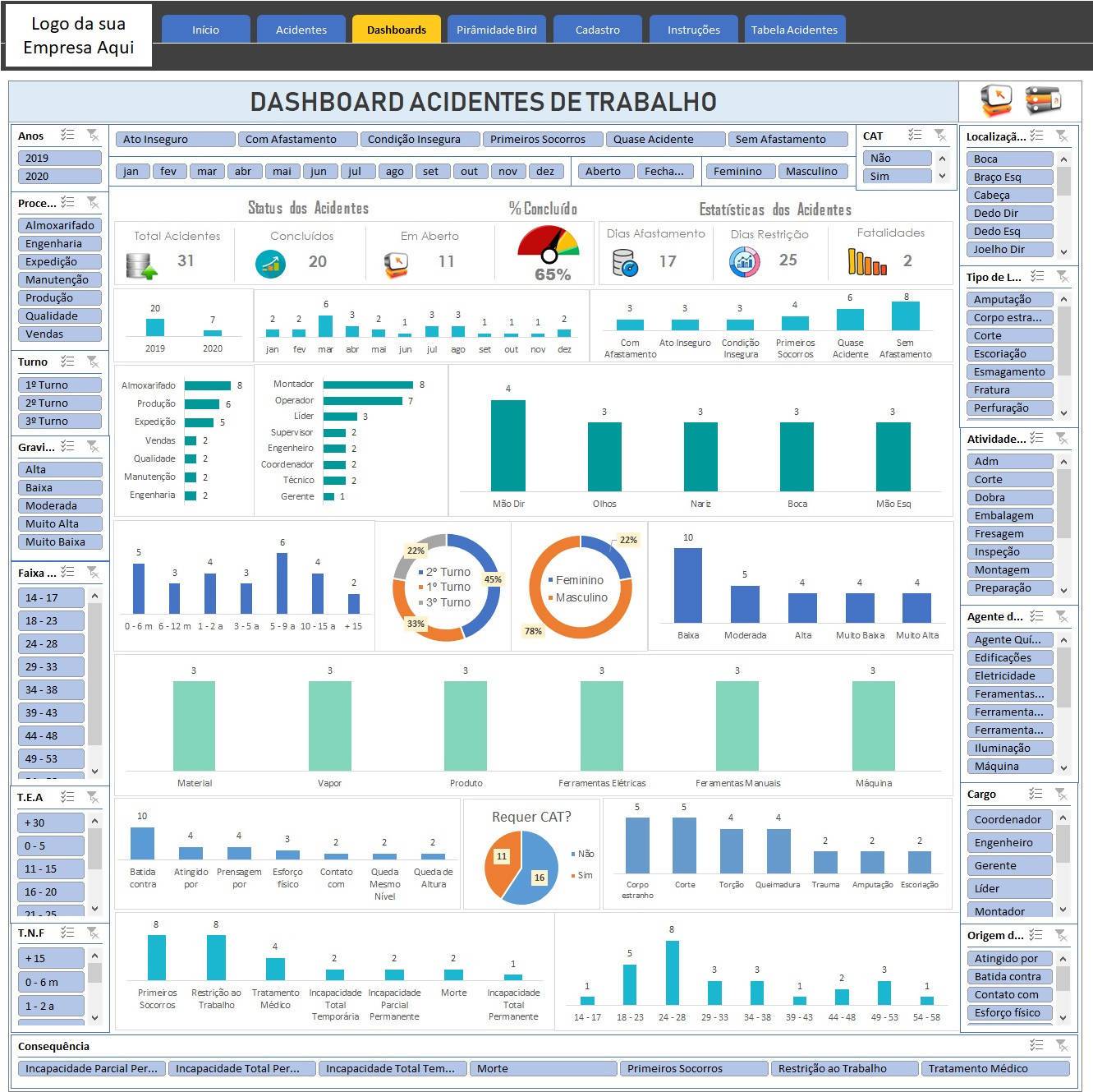 Usando este super Dashboard de Acidentes de Trabalho, você poderá centralizar o registro de todos os acidentes de trabalho de uma maneira prática e eficiente. O Dashboard foi desenvolvido para oferecer uma visão 360° no gerenciamento de acidentes de trabalho para garantir uma avaliação precisa e consistente de acidentes de trabalho, facilitando o processo de tomada de decisão, ação corretiva e melhoria contínua.