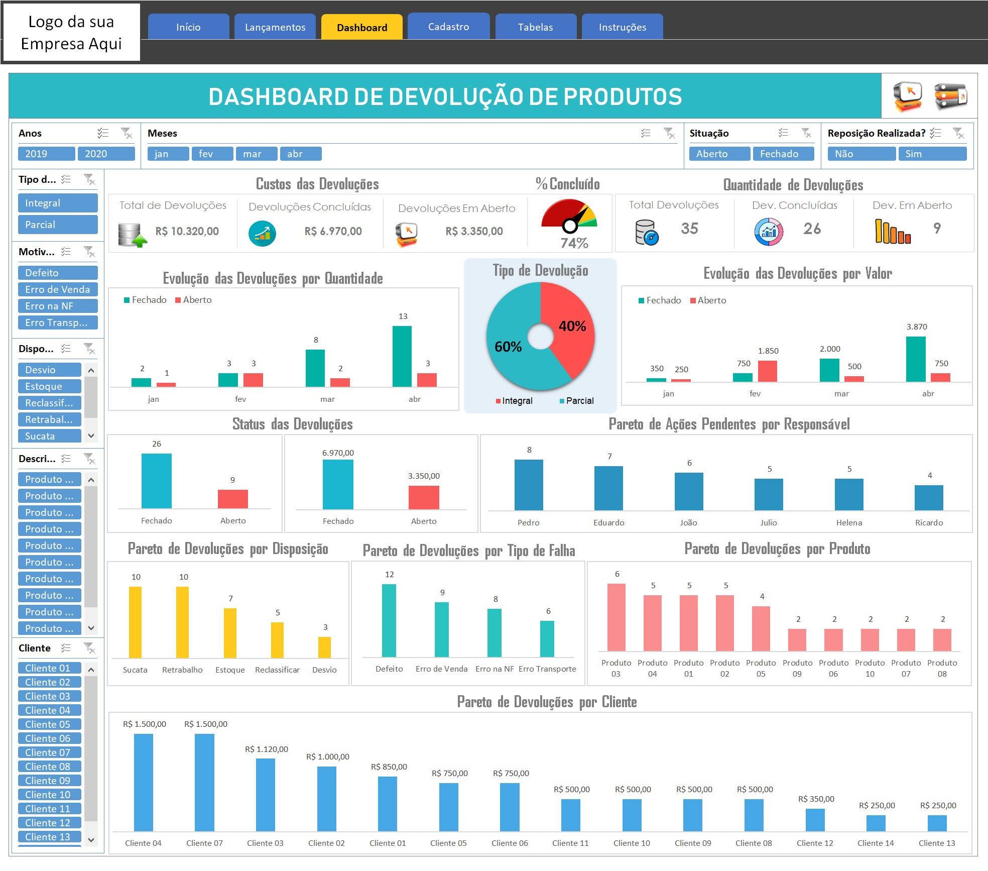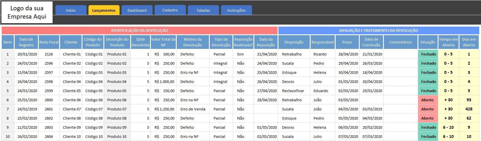 Registre e monitore as devoluções de produto / mercadorias em uma única planilha centralizada, com “Andon / semáforo” para acompanhar o status de cada item e visualizar com agilidade os fatores críticos para tomada de decisão.