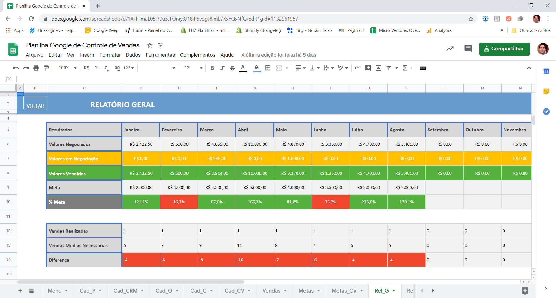 Com essa planilha você conseguirá ver o desempenho do seu funil de vendas, a quantidade de vendas realizadas, as receitas geradas e o tempo médio de negociação