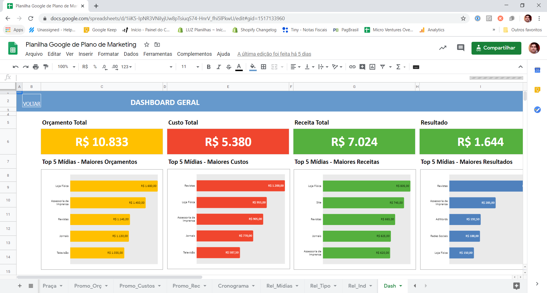 Com a planilha de plano de marketing você consegue definir e avaliar o planejamento para até 10 mídias, analisar diferentes canais de comunicação e verificar o orçamento utilizado para cada uma dessas campanhas