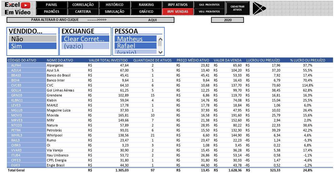 Lista das vendas de ativos do ano definido, trazendo as informações necessárias para lançar no imposto de renda.