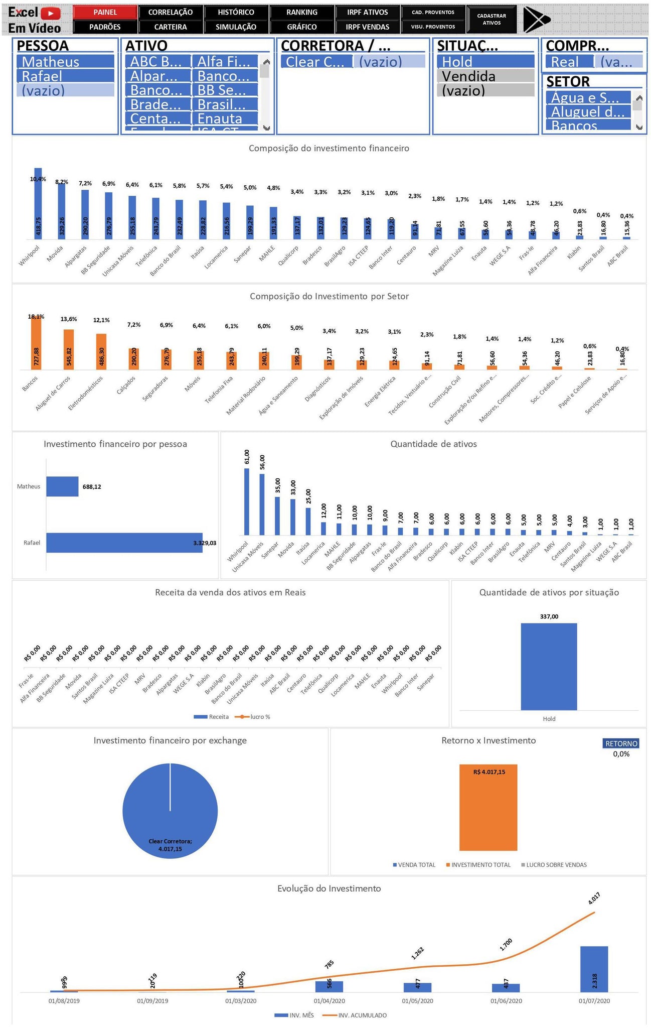 Visualizar graficamente os dados da sua carteira, facilitando o controle e visualização dos resultados: Composição do investimento por ativo e por setor, investimento por pessoa, quantidade de ativos, receita com vendas, investimento por corretora/exchange, retorno do investimento e evolução do investimento.