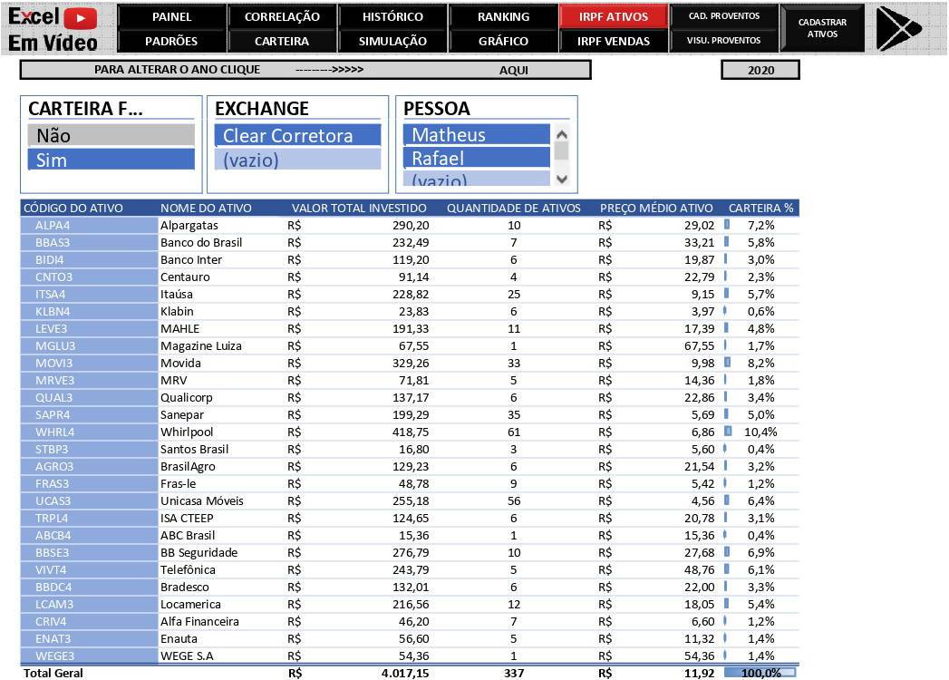 Um dos principais diferenciais que ela possui é a lista dos investimentos ativos e das vendas realizadas em determinado ano com todos os dados que você precisa para lançar no IRPF; a previsão do tempo de retorno dos seus investimentos e a análise da correlação dos ativos que você inserir, afim de diminuir seus riscos.