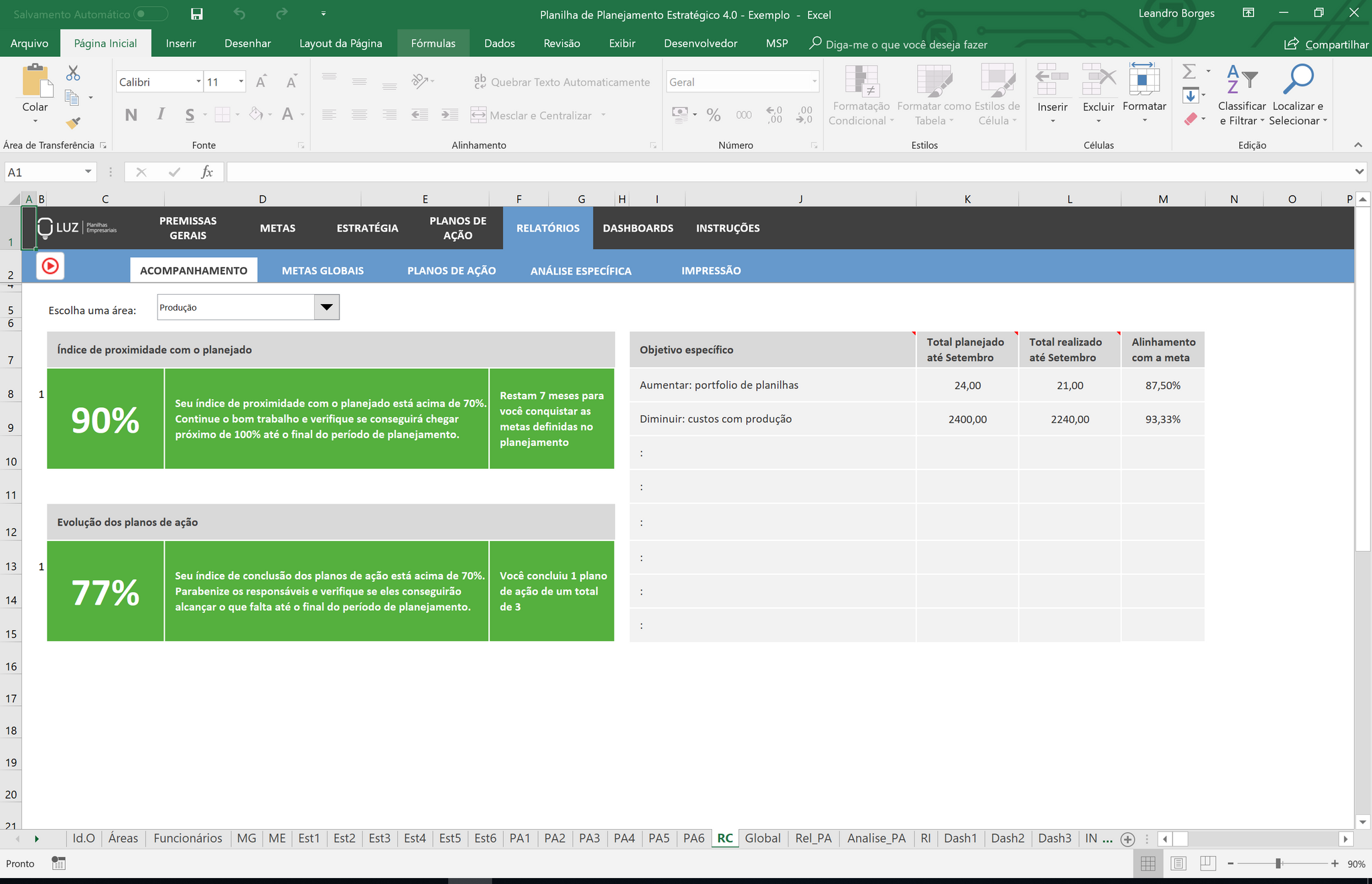 Ao preencher seus resultados na planilha, automaticamente são gerados os índices de sucesso das suas metas globais.